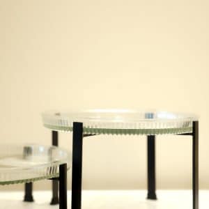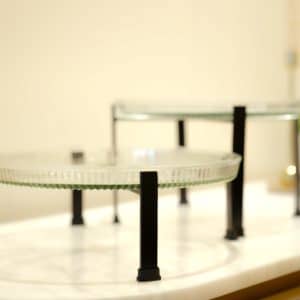 The Bella Fluted Glass Platter rests on a black/ gold metal base, creating a visually striking centrepiece.