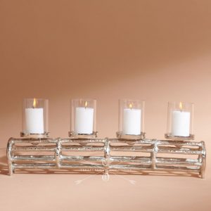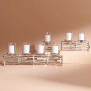 Inspired by the bark of a tree, this elegant tealight centerpiece angles its way down the center of a room. Delicate glass shades hold the tealights sitting on top of the bark. This beautiful bark comes in 3 sizes. You can pair them up or use them individually to make a statement on your coffee table, your console or dinning table.